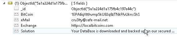 We were able to analyze the stats data we saw in our report (metadata on total number of records, uptime, names of the collection etc.), as well as 20-records sample extracted from the database shortly before it has been wiped out and ransom note appeared.